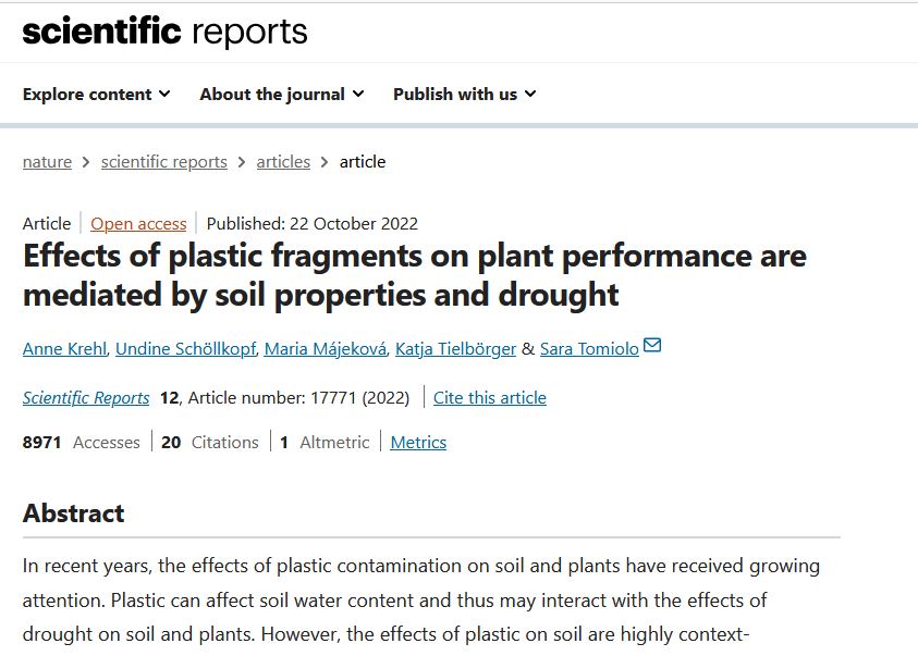 Krehl, A., Schöllkopf, U., Májeková, M. Tielbörger, K., Tomiolo, S. “Effects of plastic fragments on plant performance are mediated by soil properties and drought.” Sci Rep 12, 17771(2022).