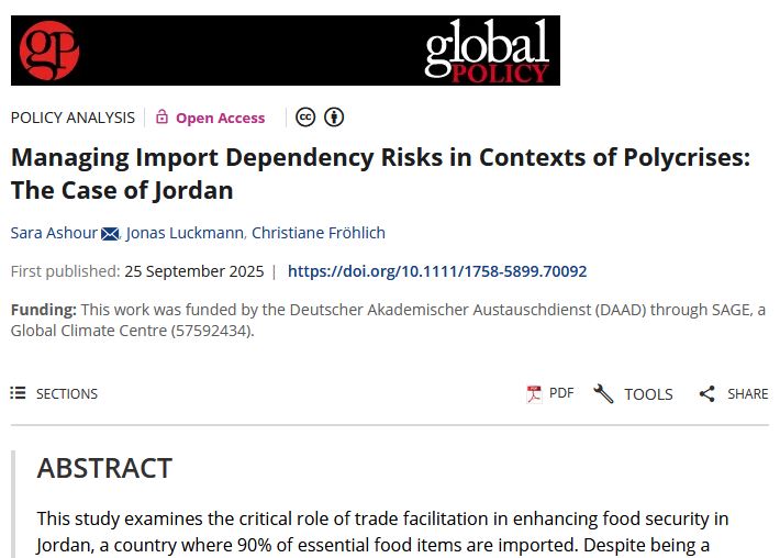 Ashour, Sara / Luckmann, Jonas / Fröhlich, Christiane. “Managing Import Dependency Risks in Contexts of Polycrises: The Case of Jordan.” Global Policy,2025; 0:1–14.