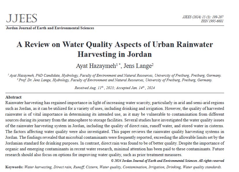 Hazaymeh, Ayat / Lange, Jens. “Urban Rainwater Harvesting in Jordan: A Review of Water Quality Aspects.” Jordan Journal of Earth and Environmental Sciences 15 (3) 2024: 199-207.