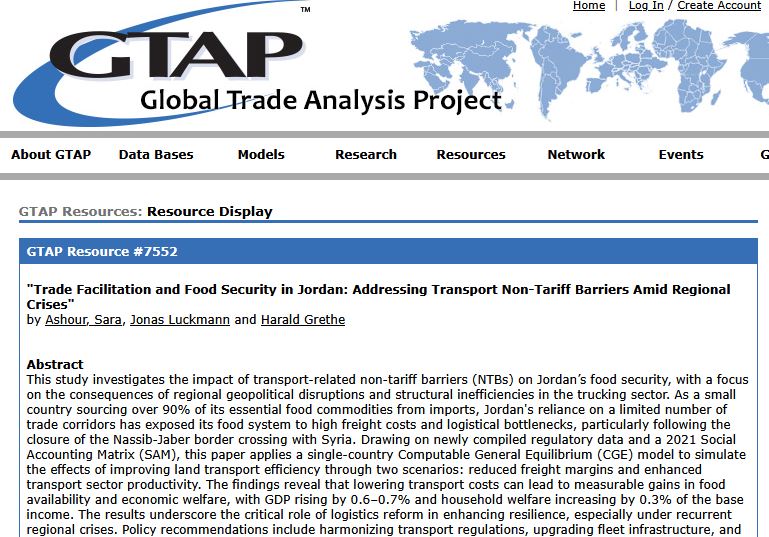 Ashour, Sara / Luckmann, Jonas / Grethe, Harald. “Trade Facilitation and Food Security in Jordan: Addressing Transport Non-Tariff Barriers Amid Regional Crises.” Conference Paper: 28th Annual Conference on Global Economic Analysis (Kigali, Rwanda) 2025.